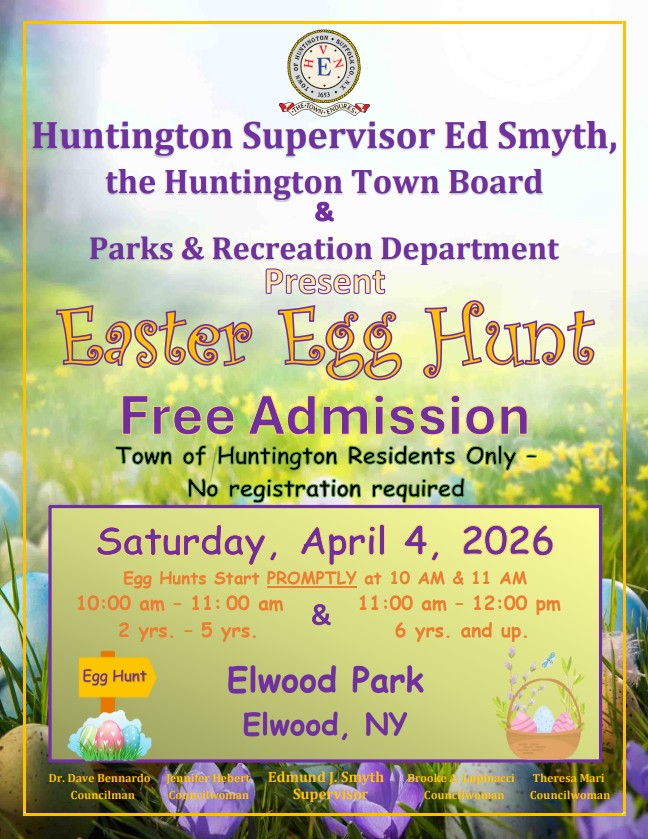 Supervisor Ed Smyth, the Huntington Town Board, and the Department of Parks and Recreation present this year's Easter Egg Hunt on April 4 at Elwood Park. Admission is free for Town of Huntington residents aged 2-5 and 6 and up, and no registration is required. Egg hunts will begin promptly at 10:00am and 11:00am. For more information, please contact the Department of Parks and Recreation at (631) 351-3089.