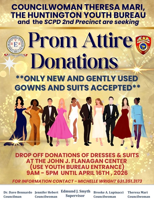 Councilwoman Theresa Mari, the Huntington Youth Bureau, and the SCPD 2nd Precinct are seeking prom attire donations for Project Prom. Only new and gently used gowns and suits are accepted. Drop off donations at the Youth Bureau entrance of the Flanagan Center (423 Park Avenue, Huntington) 9am-5pm until April 16, 2026. For more information, please contact Michelle Wright at (631) 351-3173.