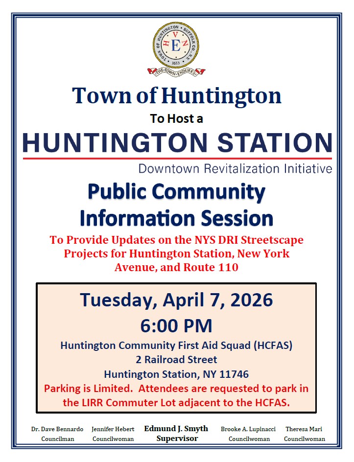 On Tuesday, April 7, the Town of Huntington will host a public community information session at the Huntington Community First Aid Squad (2 Railroad Street, Huntington Station) to discuss the Huntington Station Downtown Revitalization Initiative. The session will provide updates on the New York State DRI streetscape projects for Huntington Station, New York Avenue, and Route 110. The community is welcome to attend. Please note that parking is limited, and attendees are requested to park in the LIRR Commuter Lot adjacent to the HCFAS.