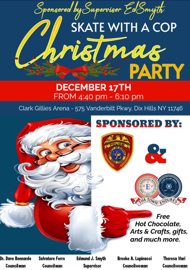 Supervisor Ed Smyth and the Town Board invite you to Skate With A Cop. Join us on December 17th from 4:40pm-6:10pm at the Clark Gillies Arena (575 Vanderbilt Parkway, Dix Hills).