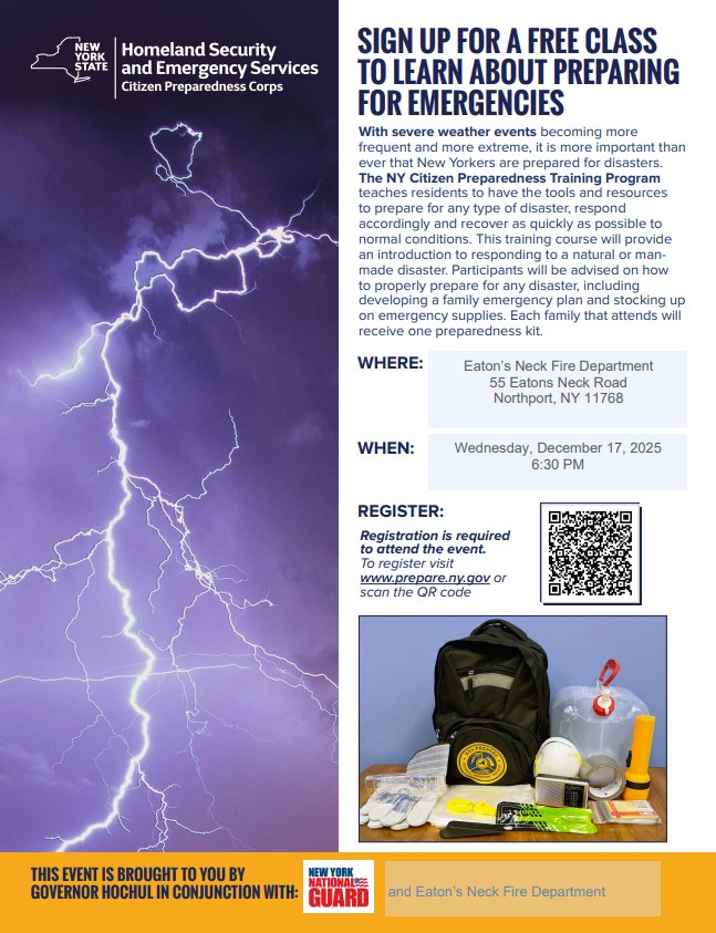 Supervisor Ed Smyth and Highway Superintendent Andre Sorrentino, in conjunction with the New York State Department of Homeland Security and Emergency Services Citizen Preparedness Corps, will host the NY Citizen Preparedness Training Program on December 16 and 17. The training course teaches residents how to properly respond to a natural or manmade disaster and prepare accordingly, and will take place at Town Hall and at Eaton’s Neck Fire Department. Each family that attends will receive one preparedness kit.