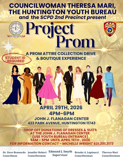 Councilwoman Theresa Mari, the Huntington Youth Bureau, and the SCPD 2nd Precinct are seeking prom attire donations for Project Prom. Only new and gently used gowns and suits are accepted. Drop off donations at the Youth Bureau entrance of the Flanagan Center (423 Park Avenue, Huntington) 9am-5pm until April 16, 2026. Project Prom will take place on April 29 from 4pm-6pm. Student ID required. For more information, please contact Michelle Wright at (631) 351-3173.