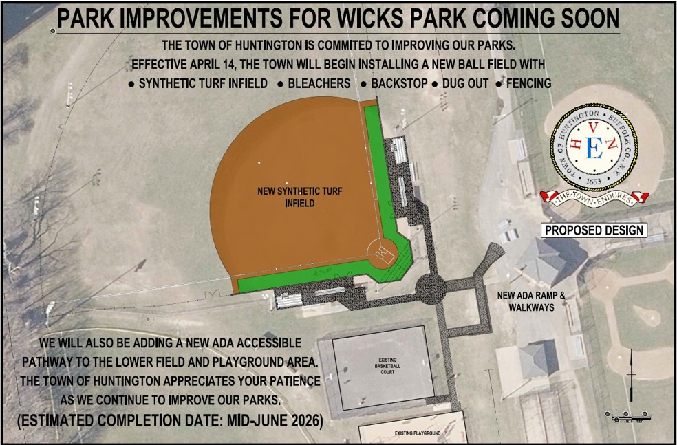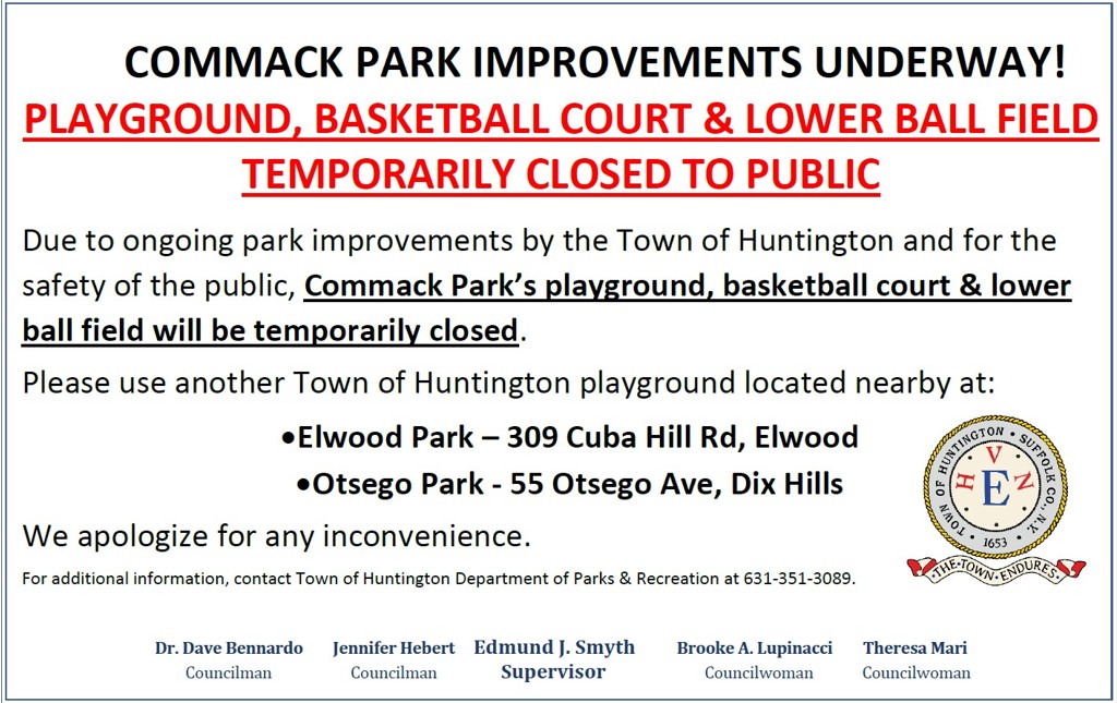 Due to park improvements by the Town of Huntington and for the safety of the public, the playground, basketball court, and lower ball field at Commack Park will be temporarily closed, effective Tuesday, April 14.